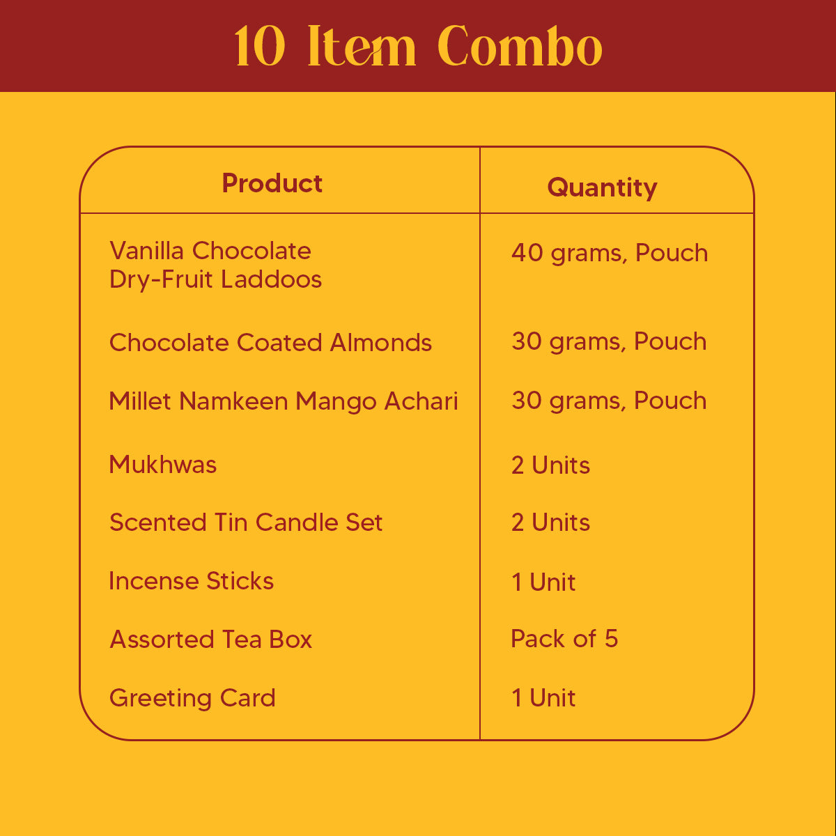 Celebrate the festival of lights with the Premium 10-Item Diwali Gift Hamper by Eat Better Co. This festive box brings together traditional warmth, aromatic touches, and wholesome indulgence, making it perfect for family, friends, or colleagues.