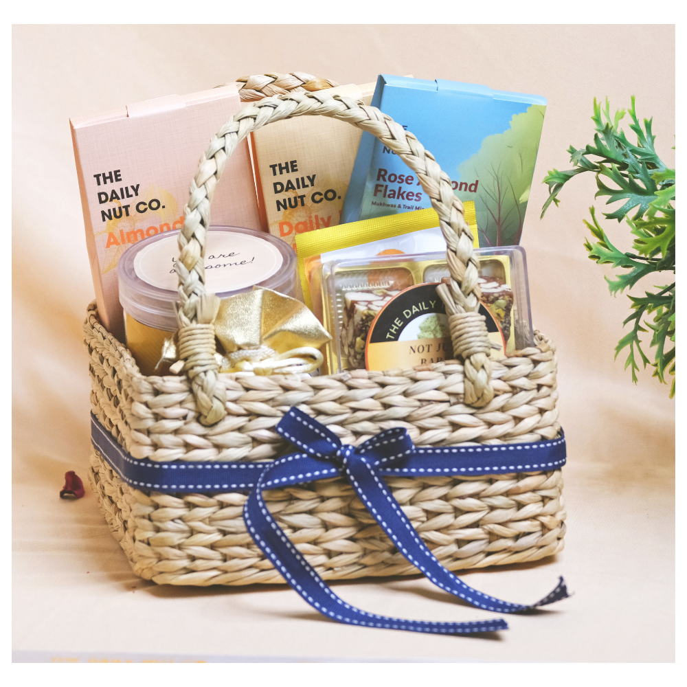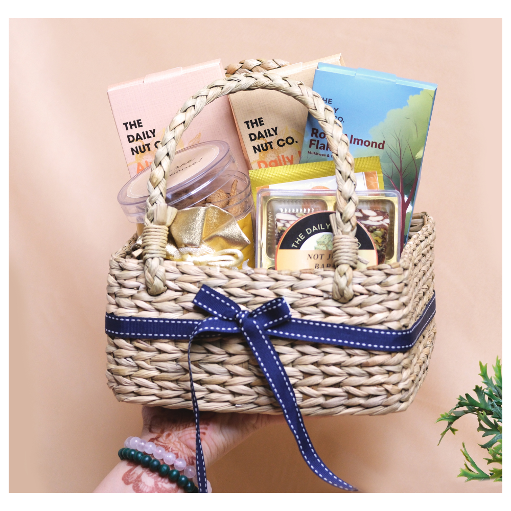 A vibrant mix of health and indulgence—featuring Trail Mix, Cashews, Rose Almond Flakes, 4 pieces of rich Mithai, and Ragi Sticks. Packed with a festive potli of Crispy Corn and Millet Mix for the perfect blend of taste and tradition.