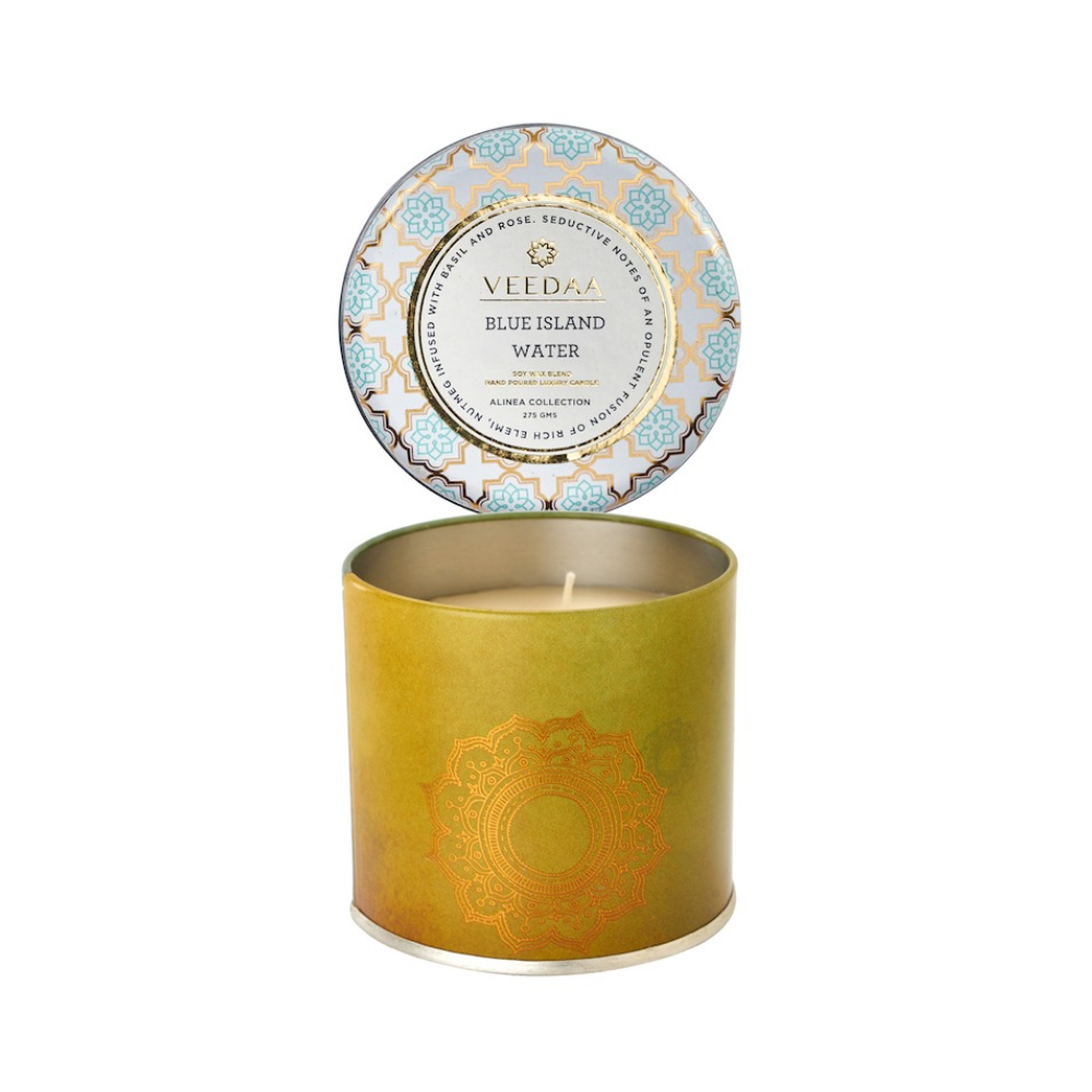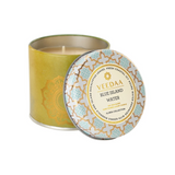 Veedaa Candles are filled with clean-burning soy wax blend. The regal metallic tins are a gorgeous addition to any room. Timeless in beauty and scent rich jewel tones adorn this contemporary mosaic design metallic option.