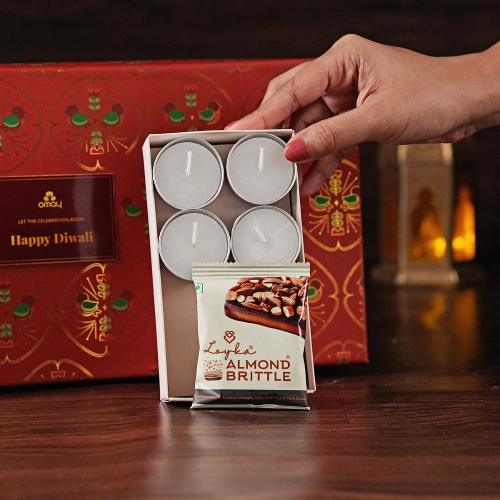 Includes: Millets & Chana Jaggery coated, 55g, Khatta Meetha Mix, 120g, Roasted Almonds - Classic Salted, 80g, Roasted Cashews - Classic Salted, 75g, Oats & Moong Mix, 75g, Nutty Mix with Dry Fruits, 50g, Chocolate Almond Brittle x 1, T-light Candles Set x 4, Diwali Greeting Card in a premium Gold-foiled gift box packing
