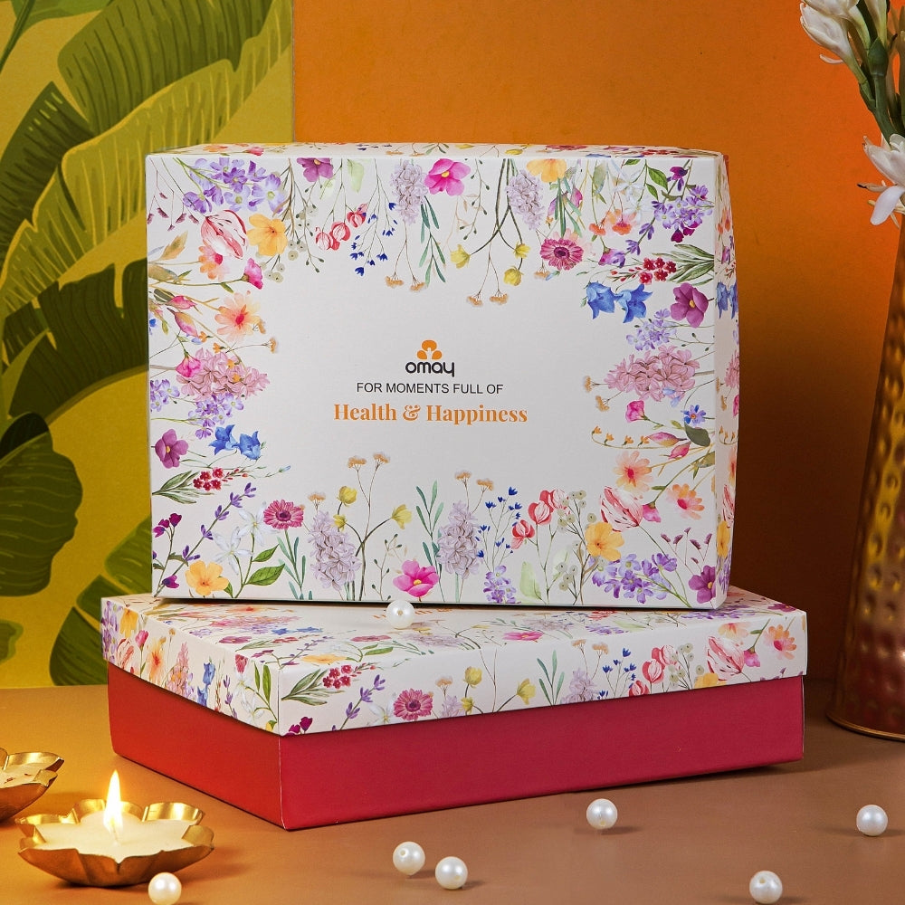 Celebrate the Joy of Diwali with Omay Foods’ Festive Nuts Gift Box – thoughtfully crafted to share warmth and appreciation with your teams, clients, friends, and family. Each elegant, festive-themed box holds a delightful mix of roasted, non-fried snacks; handpicked premium dry fruits; and indulgent treats like gur chana, herbal tea sachets and chocolate almond dates. Beautifully complemented with T-Light candles and a Diwali Greeting Card, this hamper is the perfect choice for corporate gifting or personal celebrations that deserve something truly special.