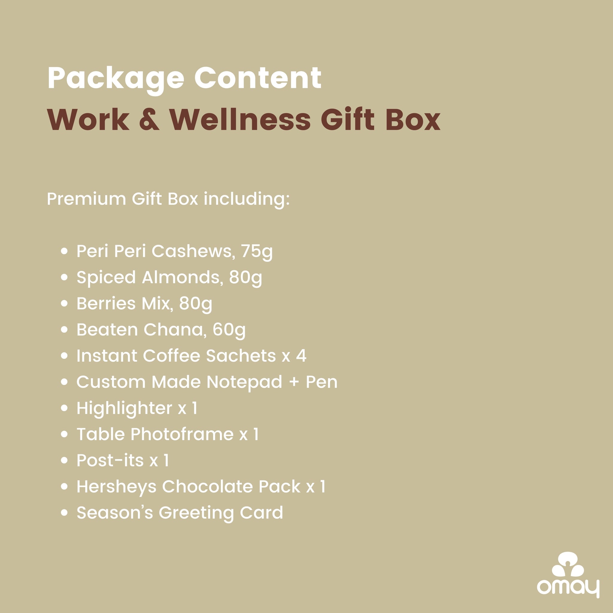 Includes: Peri Peri Roasted Cashews, 75g, Spiced Roasted Almonds, 80g, Berries Mix, 80g, Beaten Chana - Protein Rich, 60g, Instant Coffee Sachets x 4, Custom Made Notepad + Pen, Highlighter x 1, Table Photoframe x 1, Post Its x 1, Hersheys Chocolate Pack x 1, Season’s Greeting Card in a premium Gift Box Packing